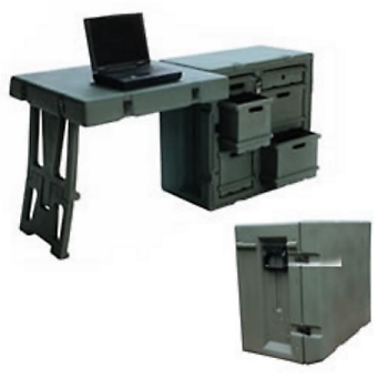 This single unit field desk folds into one durable shipping container to become mobile in an instant.